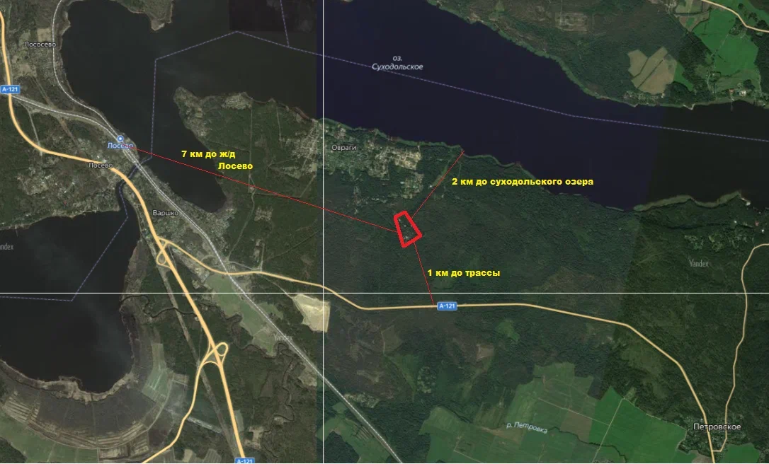 до ЖД Лосево – 7 км, до Суходольского озера – 2 км,